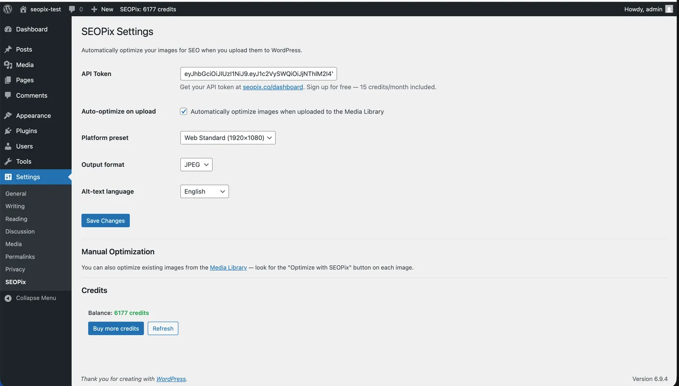 In WordPress: Settings → SEOPix → paste your token → choose preset, format, language → Save.